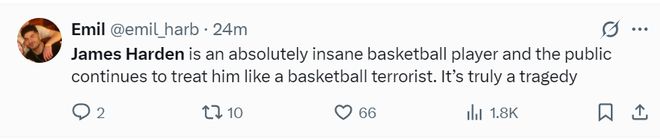 半场打完后美记:哈登是一位极其出色的篮球选手,但公众却一直把他当做篮球界的恐怖分子来对待,这实在是令人心痛。