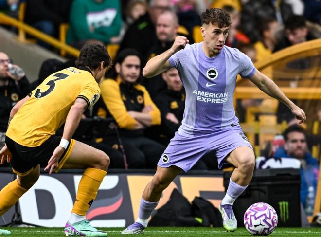 这场比赛拥有主场优势的狼队率先进球。比赛第21分钟,穆内西在禁区内凌空抽射,皮球被门将费布鲁亨扑了一下,随即击中横梁,反弹击中费布鲁亨的身体弹进球门。布莱顿也都够倒霉了。这粒乌龙球让布莱顿陷入了被动局面。半场结束,布莱顿0-1落后。布莱顿上半场控球率49%,7次射门,3次射正,没能进球。而狼队只有4次射门,进了1球。