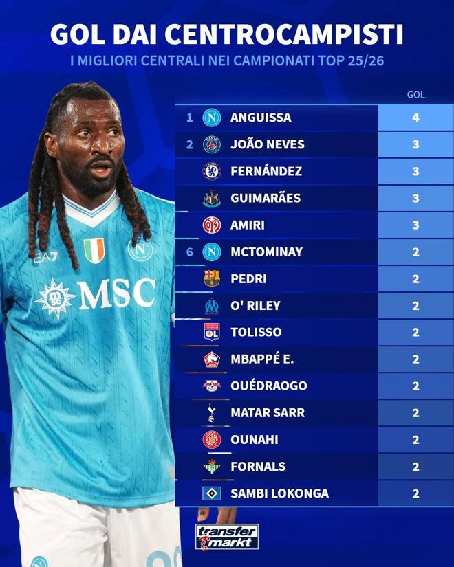 北京时间10月29日,德转统计出了本赛季至今欧洲五大联赛中场球员的进球榜,近两轮意甲连续得分的安古伊萨以4球排名第一,若昂-内维斯、恩佐-费尔南德斯、布鲁诺-吉马良斯以及阿米里以3球并列第二。